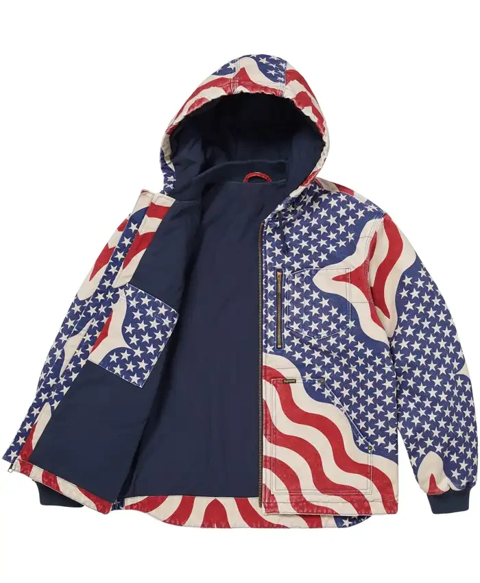 Crafted from high-quality quilted fabric, it offers lightweight warmth without adding bulk. The stitched pattern enhances durability while giving the jacket a structured and premium finish. The standout flag-inspired detailing across the exterior adds a patriotic yet fashion-forward edge, making it ideal for those who want to make a confident style statement.