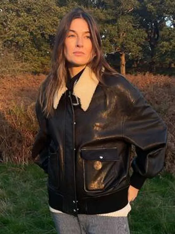Alexa Chung Street Style Aviator Flight Bomber Black Leather Jacket For Sale