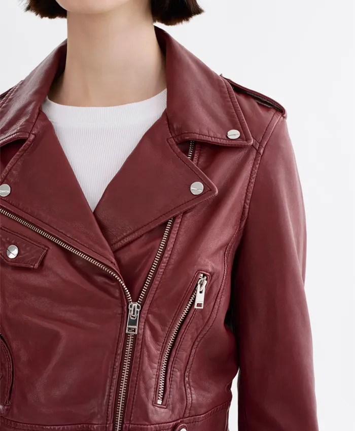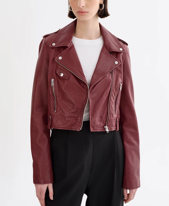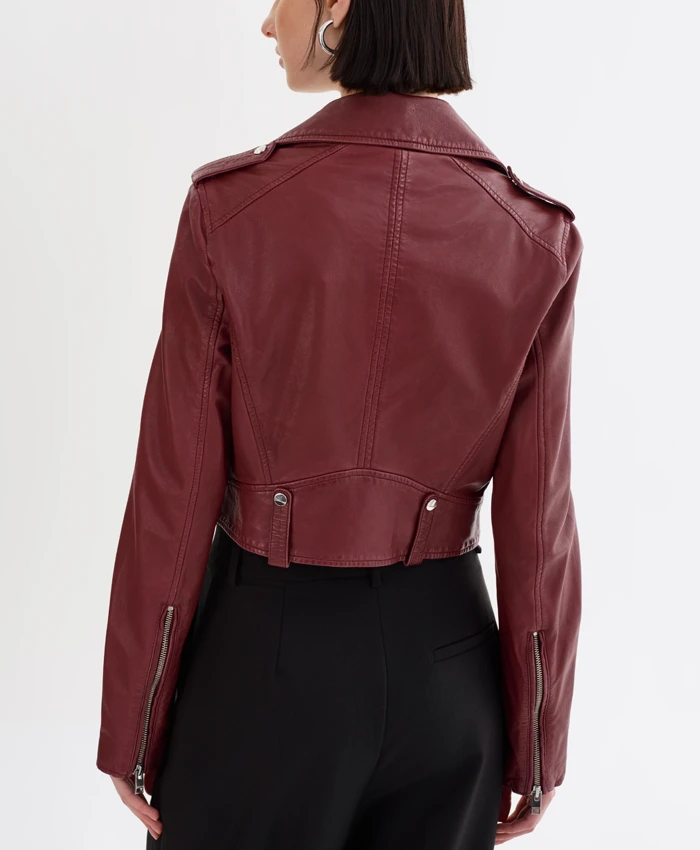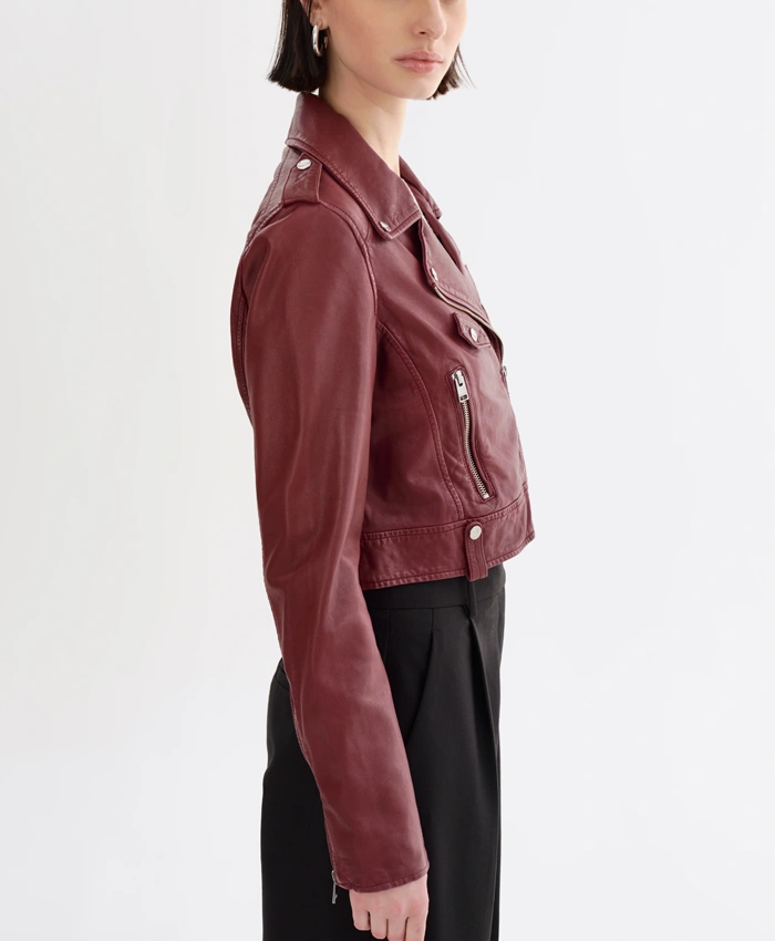 The rich burgundy color and cropped cut make this jacket a standout piece for any wardrobe.