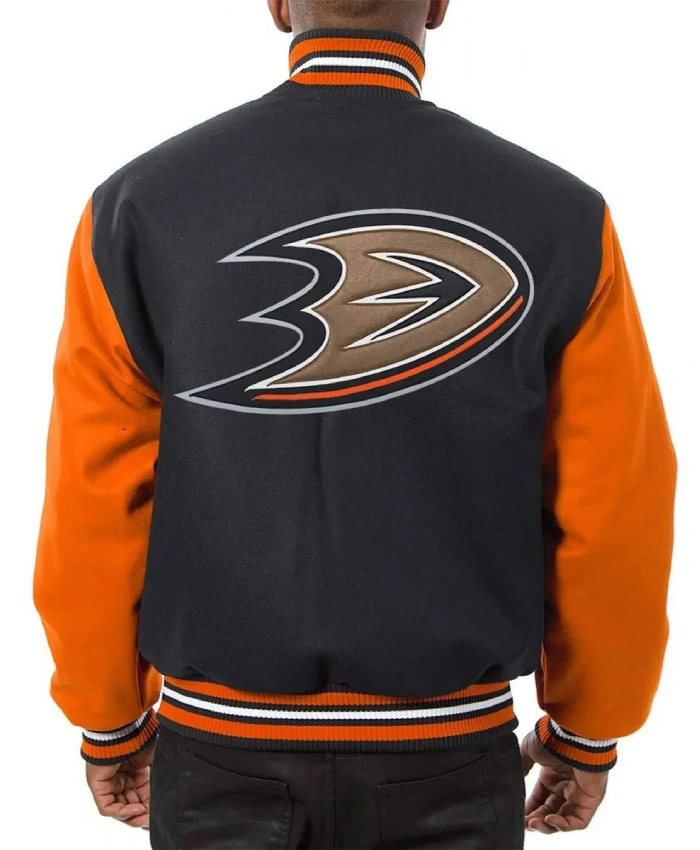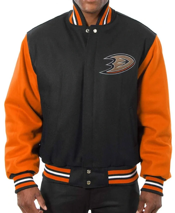 Anaheim Ducks Black and Orange Two Tone Wool/Leather Varsity Jacket For Sale
