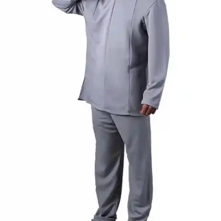 The front of the suit has a Buttoned front and has the Erect styled collars, giving an elegant look to the wearer. The best part about the jacket is that it’s Grey and comes with a pant. The Grey color looks so cool because it saves you from The dilemma of black and white; you can wear both simultaneously Because Grey is the Combo of black and white. Dr. Evil’s suit also has a pant; as mentioned before, it is also made of wool fabric and has two side pockets and one at the back. The front of the suit has a Zippered front.