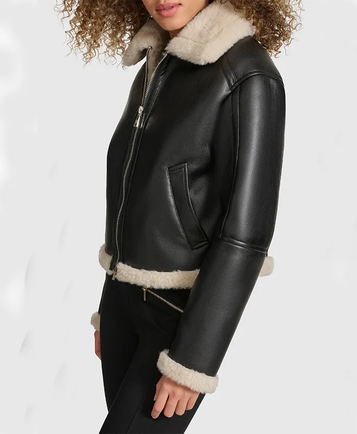 Introducing the B3 Black Aviator Shearling Coat for Women, a truly stunning piece that has a trendy and elegant design. This fabulous piece has a bold and elegant look that has the power to flip the fashion table upside down. Besides that, it is crafted with 100% real leather, making it a high-end piece in every fashion enthusiast’s wardrobe whose durability makes it last more than a year. It is available in a classy black color that emphasizes power and elegance at the same time. This jacket also offers a premium fur lining that is warm and comforting.