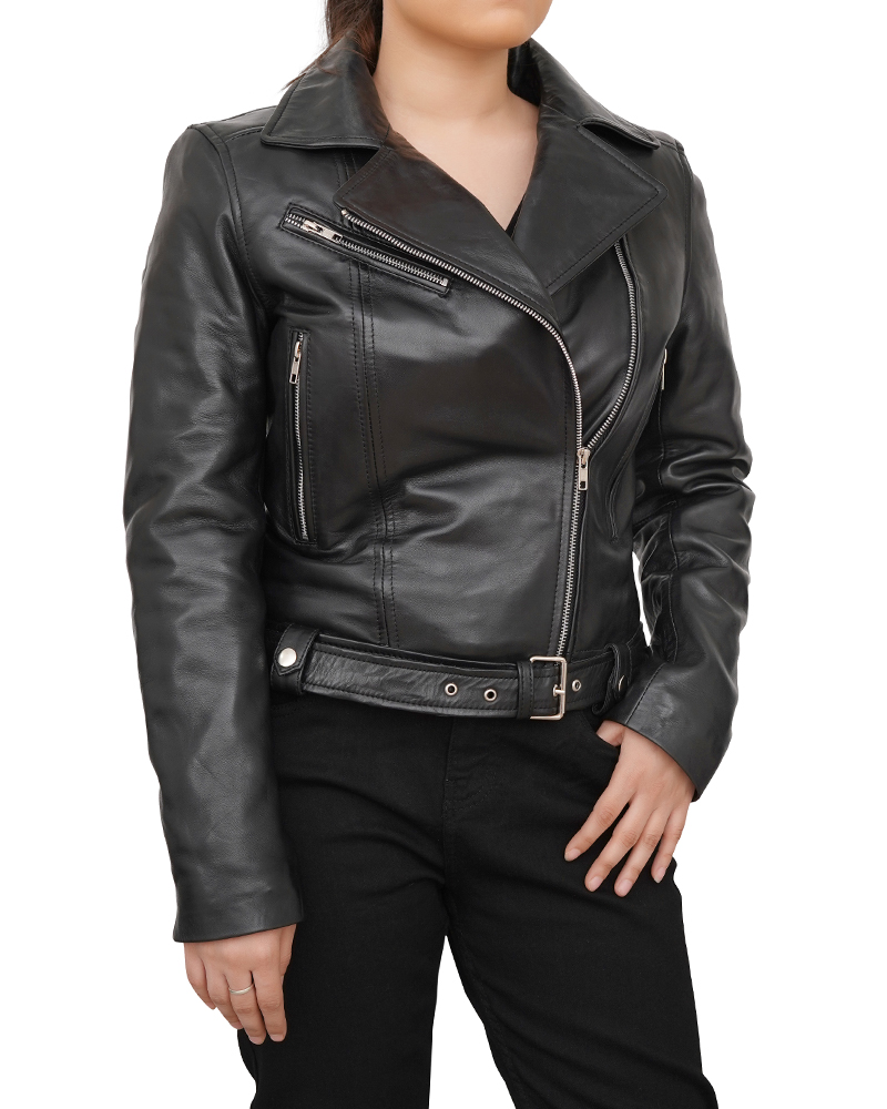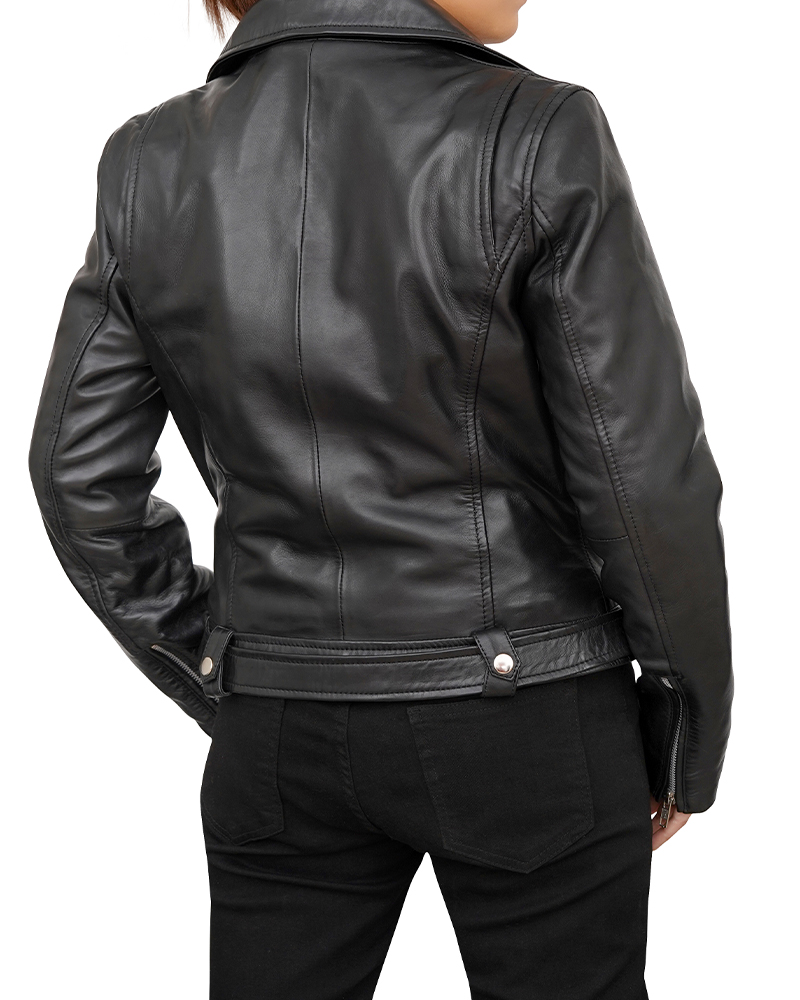 Black Asymmetrical Leather Motorcycle Jacket For Women