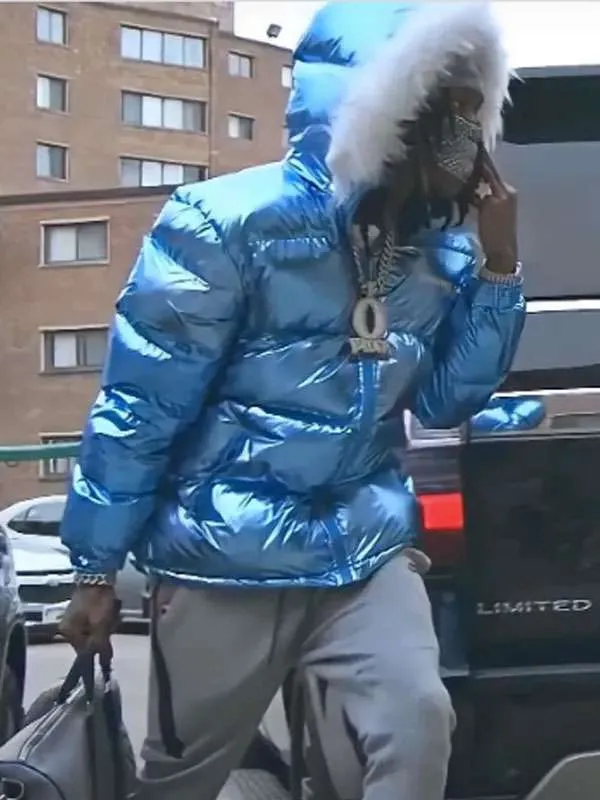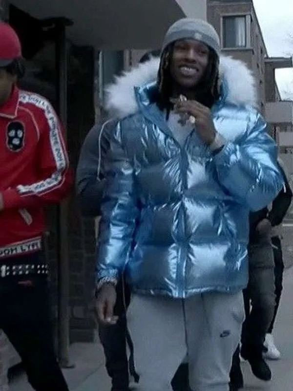 King Von Broke Opps Blue Puffer Hooded Fur Jacket For Sale Free Shipping