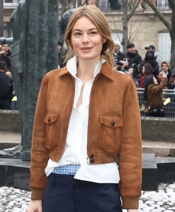 Paris Fashion Week 2025 Camille Rowe Brown Suede Leather Jacket For Sale Free Shipping Now