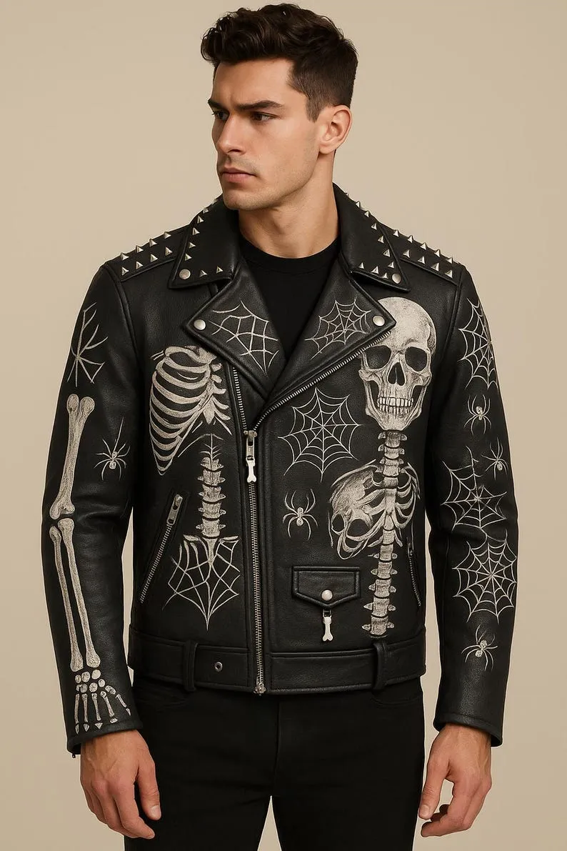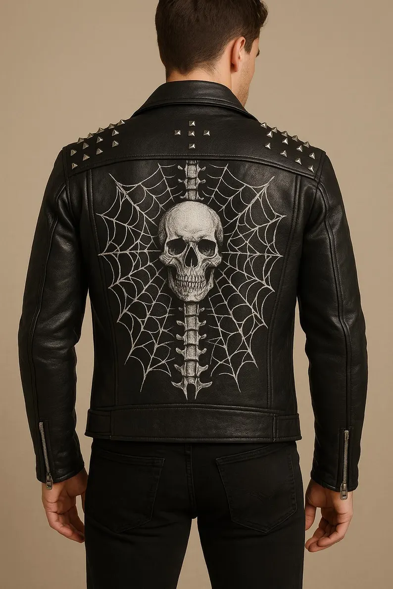 Custom Studded Skull & Spine Black Leather Biker Jacket