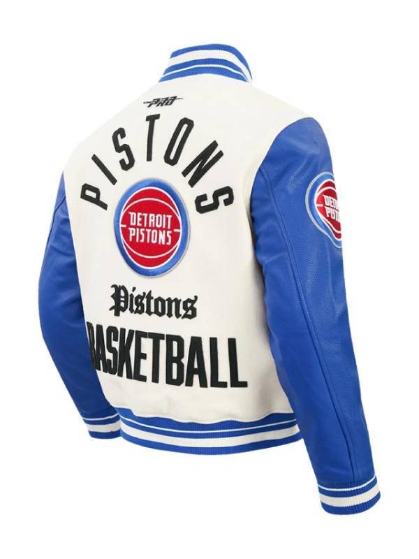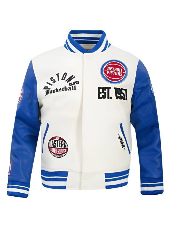 Show off your team pride in timeless style with the Detroit Pistons East Division Classic Varsity Jacket. Crafted with a premium wool body and sleek leather sleeves, this iconic varsity design delivers the perfect mix of sporty energy and vintage charm. The front and back feature bold Pistons detailing, celebrating the team’s East Division legacy. A snap-button closure, striped rib-knit cuffs, collar, and hem complete the authentic letterman look. Warm, durable, and packed with team spirit—this jacket is made for fans who want to represent Detroit in standout fashion.