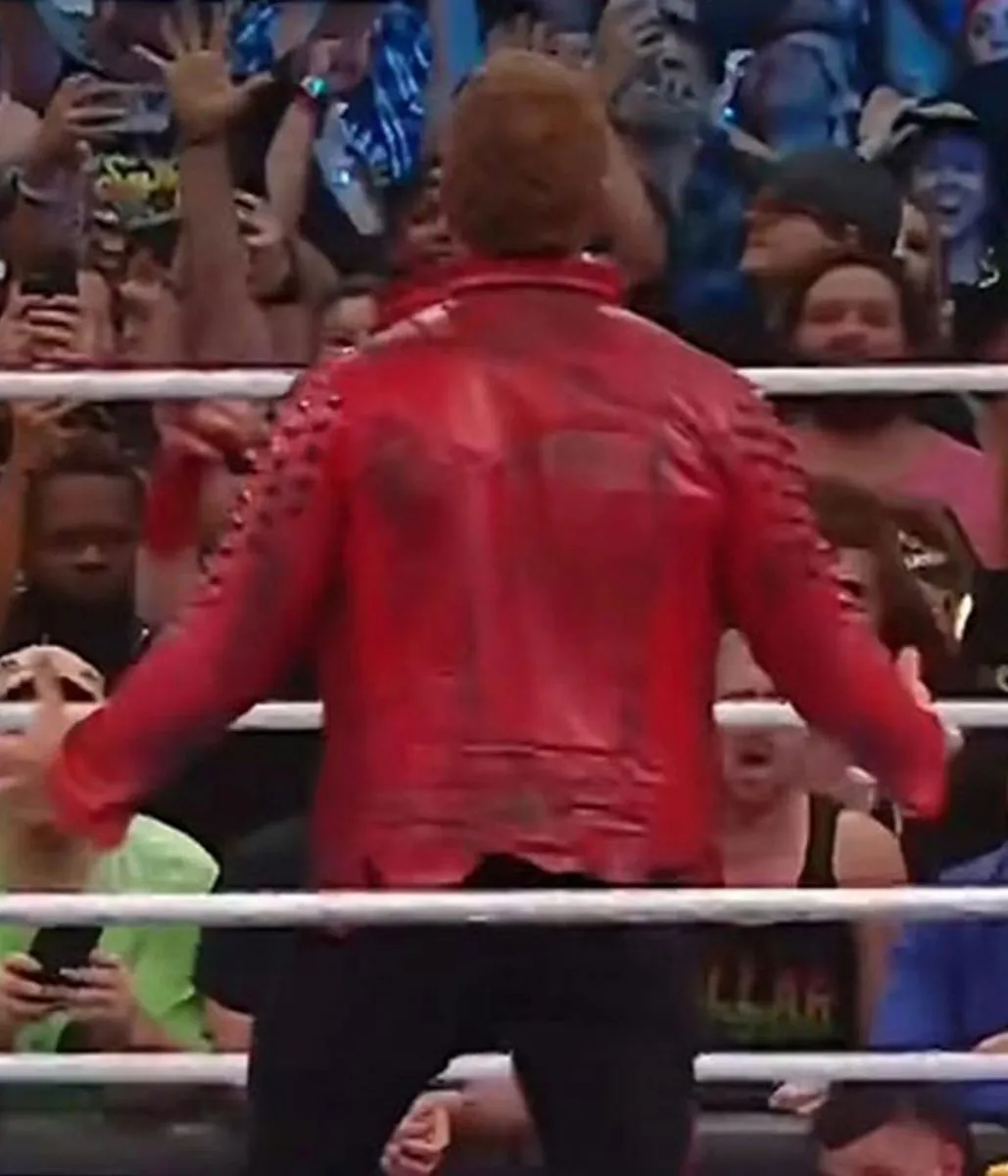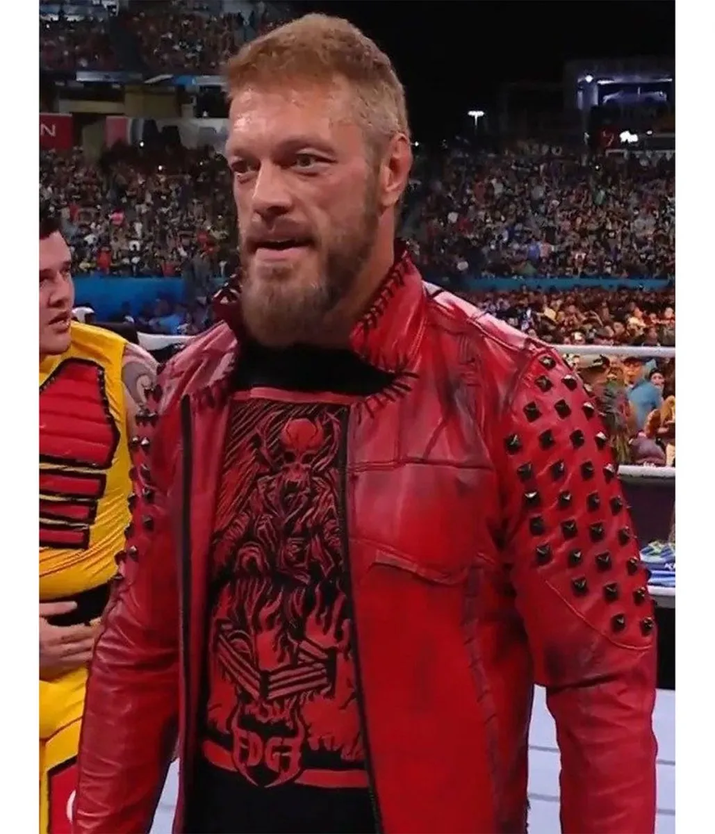 The WWE SummerSlam Edge Red Studded Jacket is a bold and stylish piece crafted from premium genuine leather, ensuring durability and luxury. Featuring a striking red color, this jacket captures attention instantly with its standout appeal.