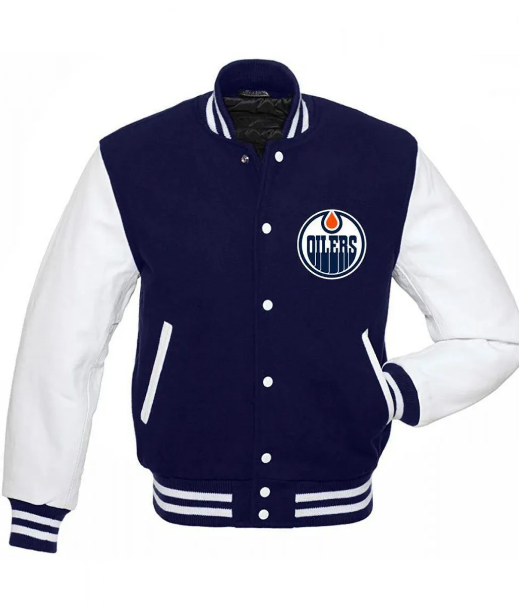 Show your Edmonton pride with the Edmonton Oilers Blue and White Letterman Jacket, a timeless piece for every hockey fan. Inspired by the energy and legacy of the NHL’s Edmonton Oilers, this varsity-style jacket combines sporty design with premium craftsmanship.