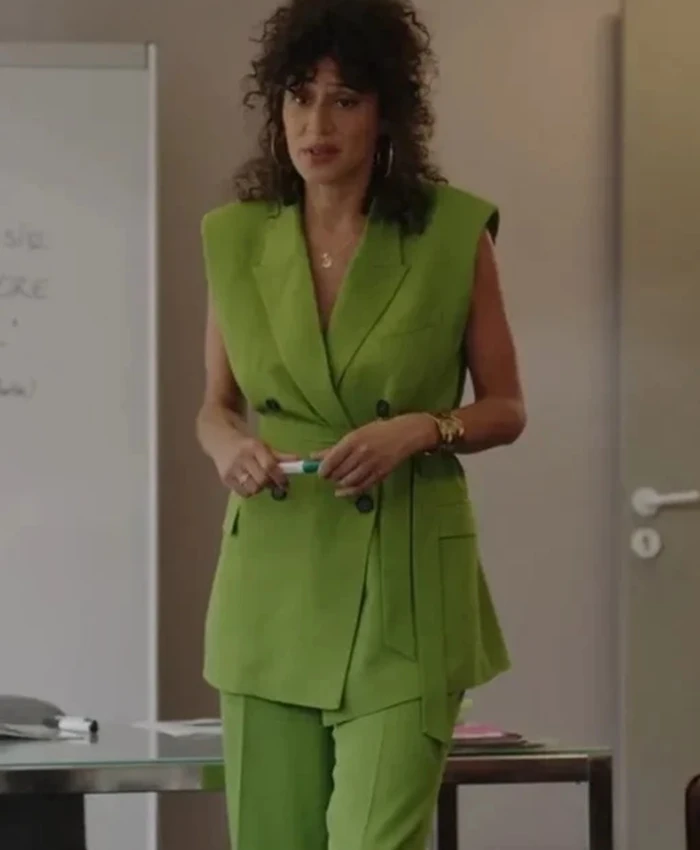 Jacqueline is Emily’s French teacher. She teaches level 1 of a French immersion course. Emily invites Jacqueline to go out and have a drink with her. Jacqueline agrees but explains that her rate outside class is ?50 per hour, so Emily quickly retracts her suggestion. She came in season 3 of Emily in Paris. The Emily In Paris S03 C?line Menville Green Suit jacket is made up of suiting material, and inside, it has a viscose lining which gives you a sense of comfort and warmth. The jacket has no sleeves. The jacket has two waist pockets outside and one inside, allowing you to keep multiple items of your desired choice. In addition, the jacket has one chest pocket, allowing you to keep petite items.