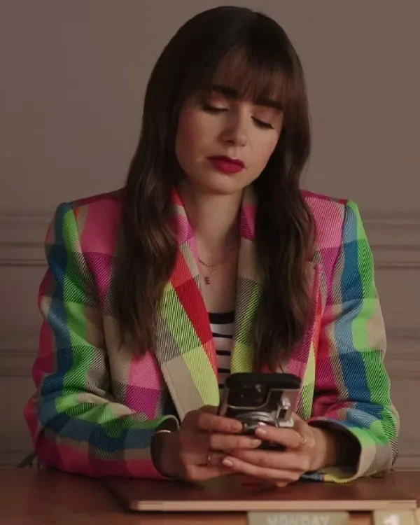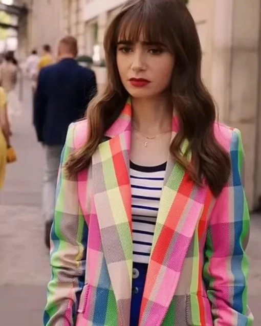 A blazer is made for special occasions, and it does not get any more special than this Emily In Paris S03 Emily Cooper Blazer right here. The idea for this pictured blazer is taken from an American comedy, drama, and romantic TV show called Emily in Paris. This blazer was featured in the second season of the show, and it was worn by one of the main characters of the show named Emily Cooper. The role of Emily Cooper is played by a British and American actress and model named Lily Collins. This Emily Cooper-inspired blazer has a beautiful color block of different colors, such as blue, white, and black, that looks amazing. This blazer is made from the finest suiting fabrics to make sure it feels premium in quality. This Lily Collins TV-Series Emily In Paris Season 3?Outfits Emily Cooper Blazer is fitted with a soft viscose lining inside to make it warm to wear. This blazer features a button on the front for closure and has a lapel-style collar that looks nice. This blazer has full-length sleeves that are fitted with open hem cuffs, and it has two side pockets as well as two inner pockets.