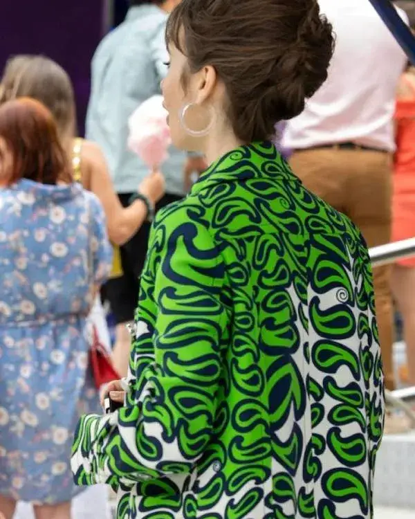 The printed coat has two pockets outside and two inside, allowing you to keep multiple items, like wallets, cell phones, keys, etc. The best part about the coat is its green color; as we all know, green is the only natural color everyone likes, and it looks equally good for both genders. We have fulfilled your curiosity and expect your attention now; if you have read so far, why not make up your mind and Buy Emily In Paris S03 outfits right now? This coat is pitch-perfect for all your gatherings and events.