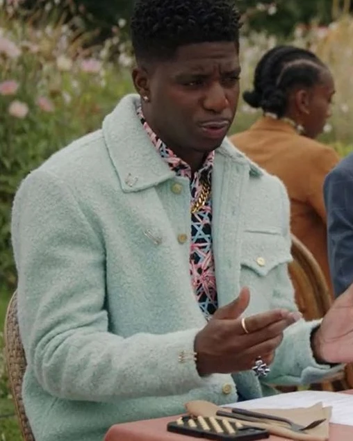 At first, Emily and Julien’s outspoken personalities clash as Julien works for Savoir. Despite his initial mistrust of Emily as a Savoir coworker, Julien becomes a close friend who informs her of the sexiest office gossip. Additionally, Julien strives to make a name for himself as an artist. Growing up, Julien idolized couture designers, particularly Pierre Cadault. He used to read Vogue magazines he had stolen from his mother’s salon to get a peek at Pierre’s lavish lifestyle. The Emily In Paris Season 3 Outfits Samuel Arnold Blue Sherpa Jacket is made up of Sherpa material, and inside, it has a viscose lining which gives you a sense of comfort and warmth.