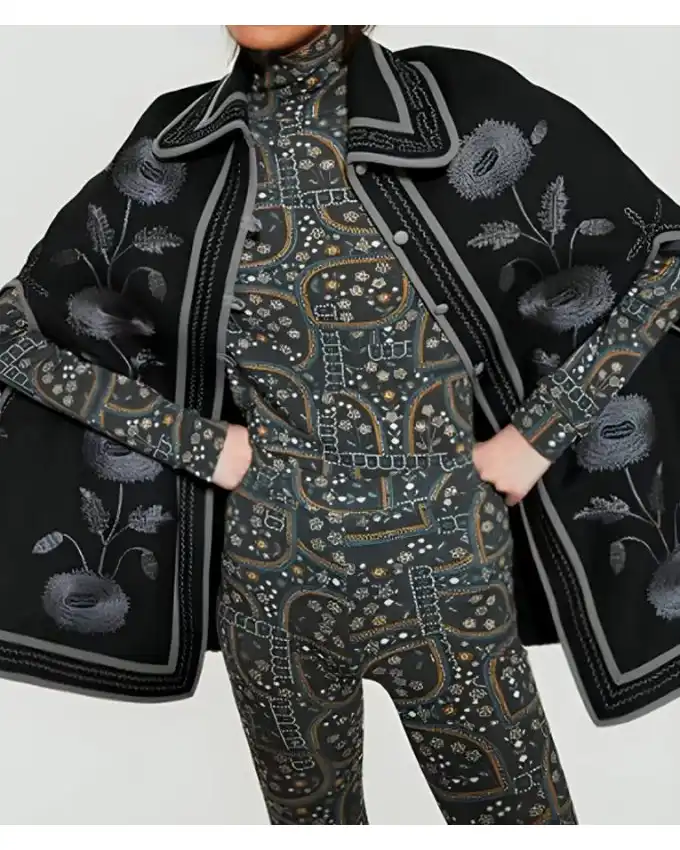 Digging into its specifications, note that this stylish floral cape-style coat is characterized by its bright and bold floral print and perfect black shade, The coat’s classic collar and buttoned closure ideally give it a modern and trendy look. Also, the coat has a unique cape-like silhouette, which adds a sensational look to Emily’s outfit. The coat has two stylish side pockets, giving it a chic look, and two inner pockets for more practical storage.