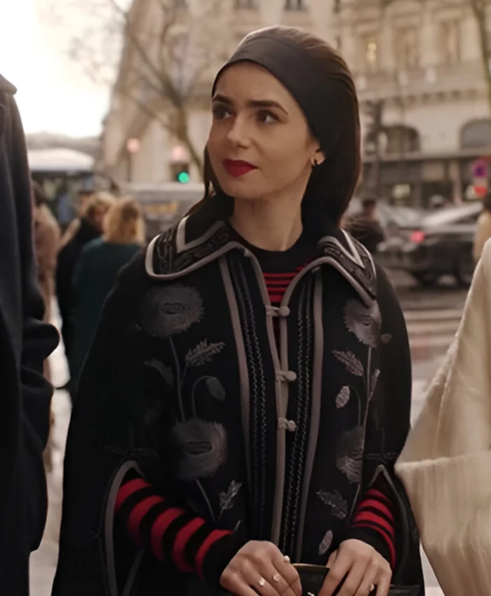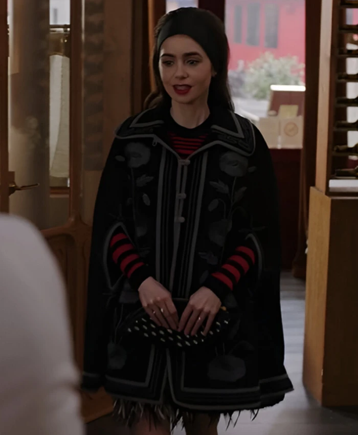 Emily Cooper TV Series Emily In Paris Season 04 Lily Collins Black Floral Cape Coat On Sale