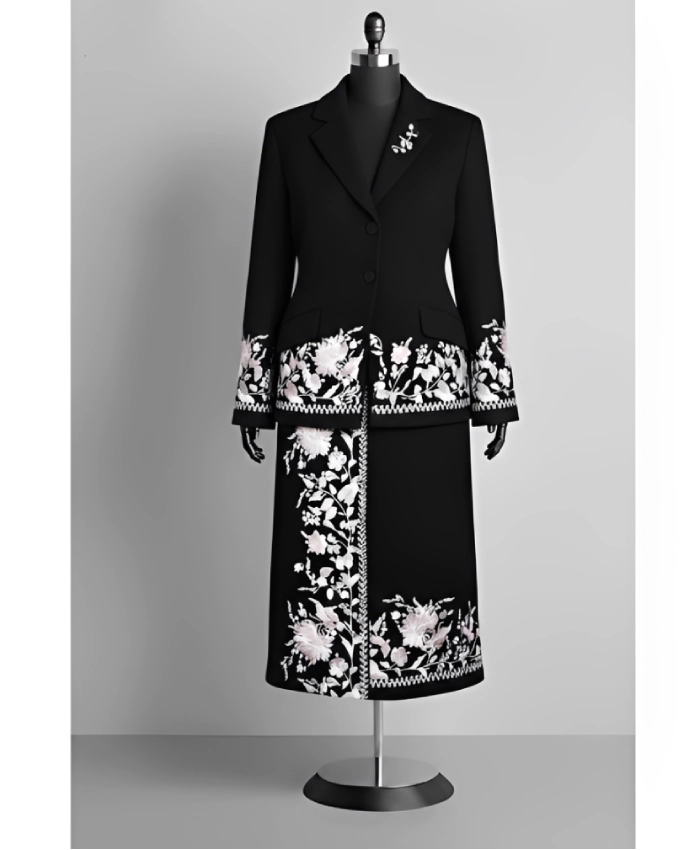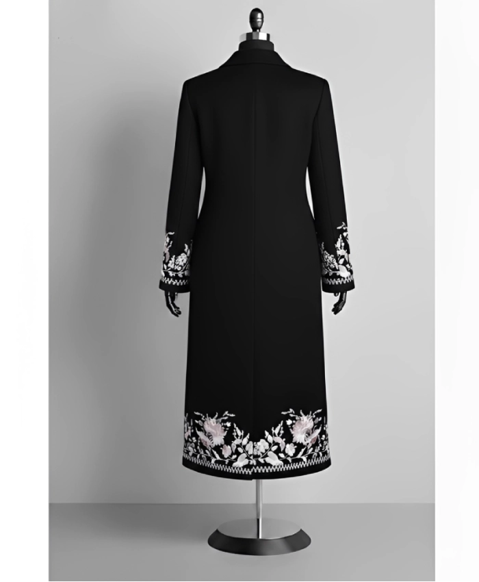 This beautifully tailored black floral coat is designed for women who appreciate statement outerwear with luxury appeal. The structured silhouette enhances your natural shape, while the delicate embroidered detailing along the hem and cuffs adds texture, dimension, and standout charm. The contrast of deep black fabric with shimmering floral accents creates a graceful yet powerful fashion statement.