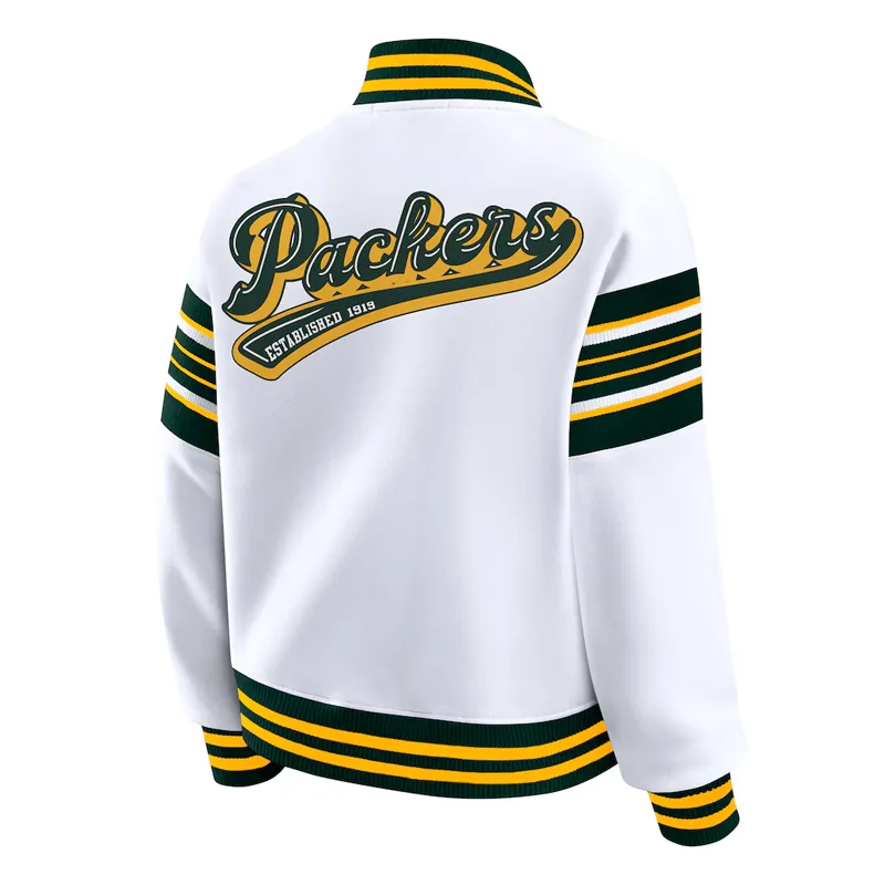 the perfect mix of comfort, warmth, and classic team pride. Crafted for true Packers supporters, this premium fleece jacket features a smooth white finish and an easy snap-front closure that offers both convenience and timeless style.