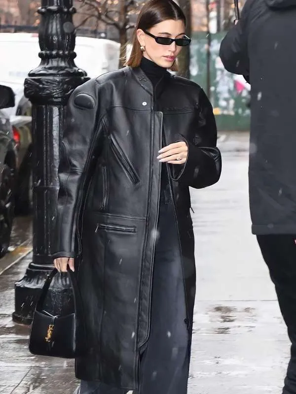 Hailey Bieber Street Style 2023 Black Leather Coat