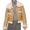 The Renee Segna shearling jacket is made from high-quality suede leather. The jacket is available in a majestic brown color which gives it an innovative and enchanted look. The collar of the jacket is shearling style. It has a branded YKK zipper front closure. A soft faux shearling inner lining of the jacket keeps you warm and relaxed. The sleeves of the Hightown BFO Riley Voelkel suede shearling jacket are long ends with shearling cuffs. The jacket has two side waist pockets and two inside pockets for keeping stuff. The fine quality stitching of the Renee Segna shearling jacket makes it durable and comfortable to wear. The jacket is an ideal choice for parties.