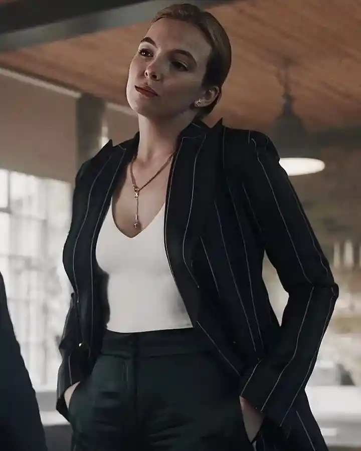 Looking for something special? Which puts glamour into your personality. Then check Jodie Comer Killing Eve Villanelle Black Striped Blazer, inspired by the American TV series “Killing Eve” Season 4 character Villanelle. English actress Jodie Comer plays Villanelle’s character.?Jodie Comer Villanelle Black Striped Cotton Blazer?is very amazing. So if you love to wear fashionable celebrity outwear, then?this blazer would be an excellent choice for you.?