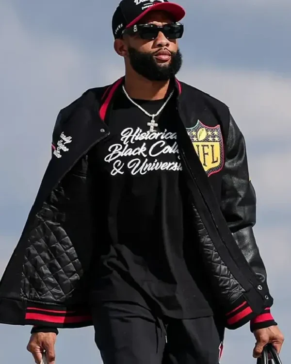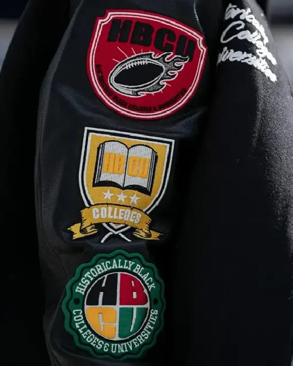 Shop KhaDarel Hodge HBCU Embroidered NFL Shield & Pan-African College Patches Black Varsity Letterman Jacket For Sale
