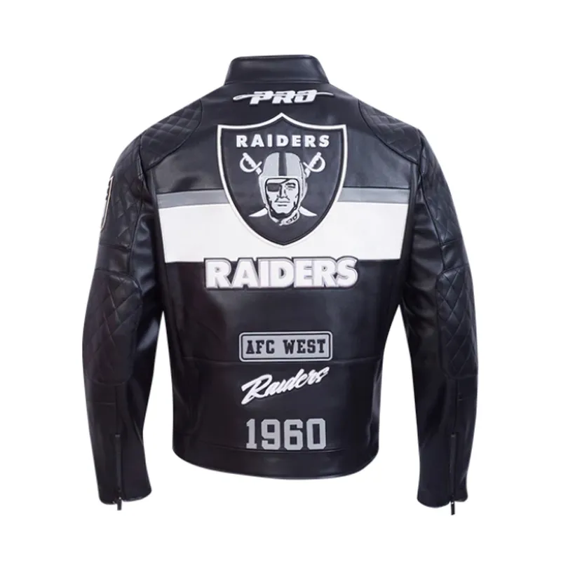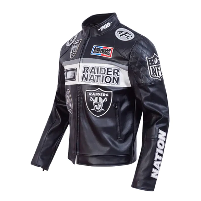 Draped in bold black, the jacket captures the fierce spirit of the Raiders. It features a modern stand-up collar, smooth zipper closure, and full-length sleeves detailed with signature patches and team lettering — a true symbol of team pride. Reinforced shoulder padding adds a rugged moto edge while enhancing structure and style.