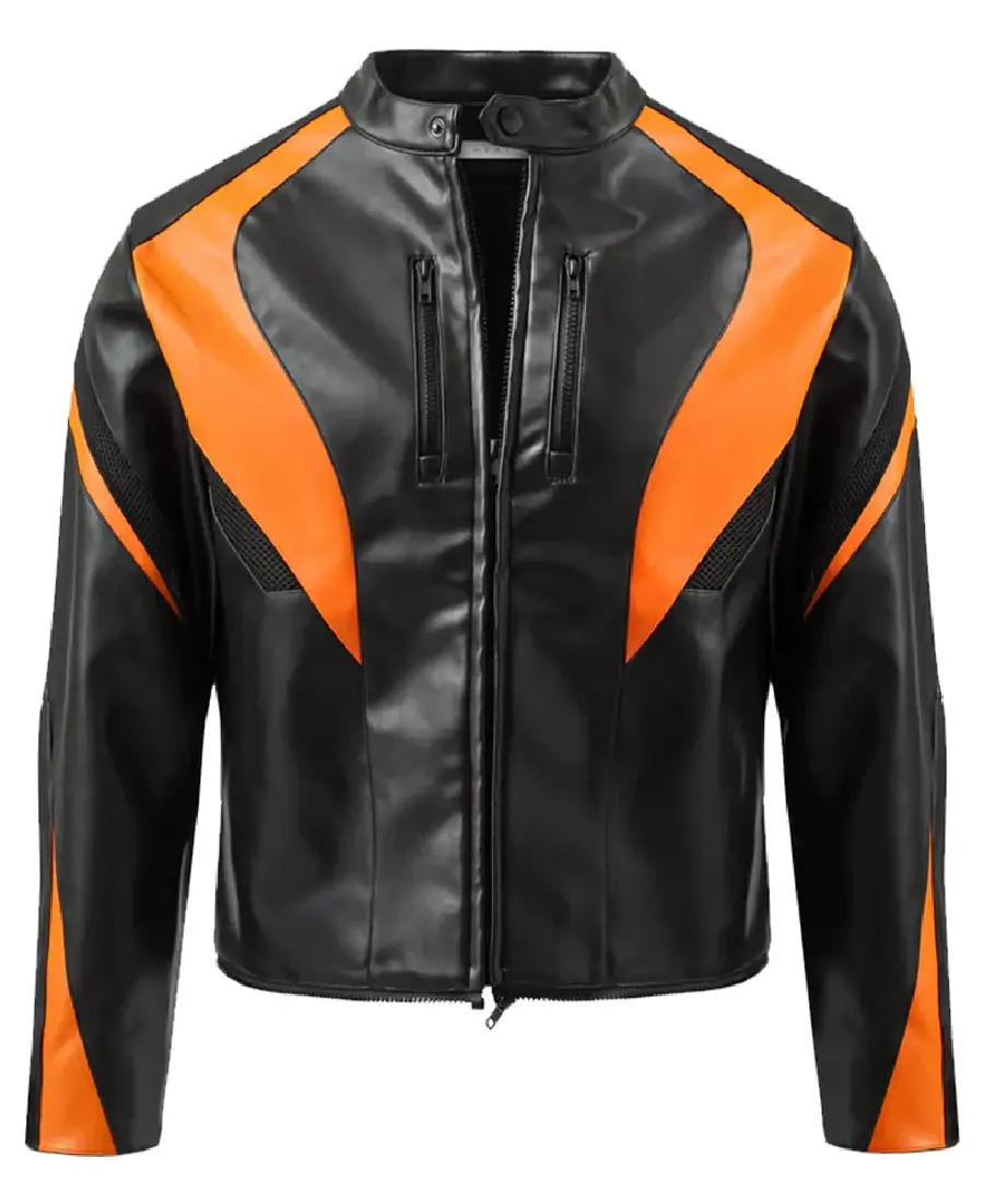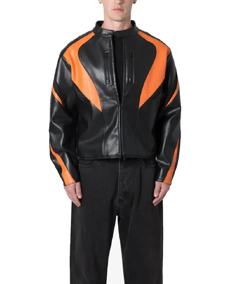Men’s Black and Orange Cropped Motorcycle Leather Jacket