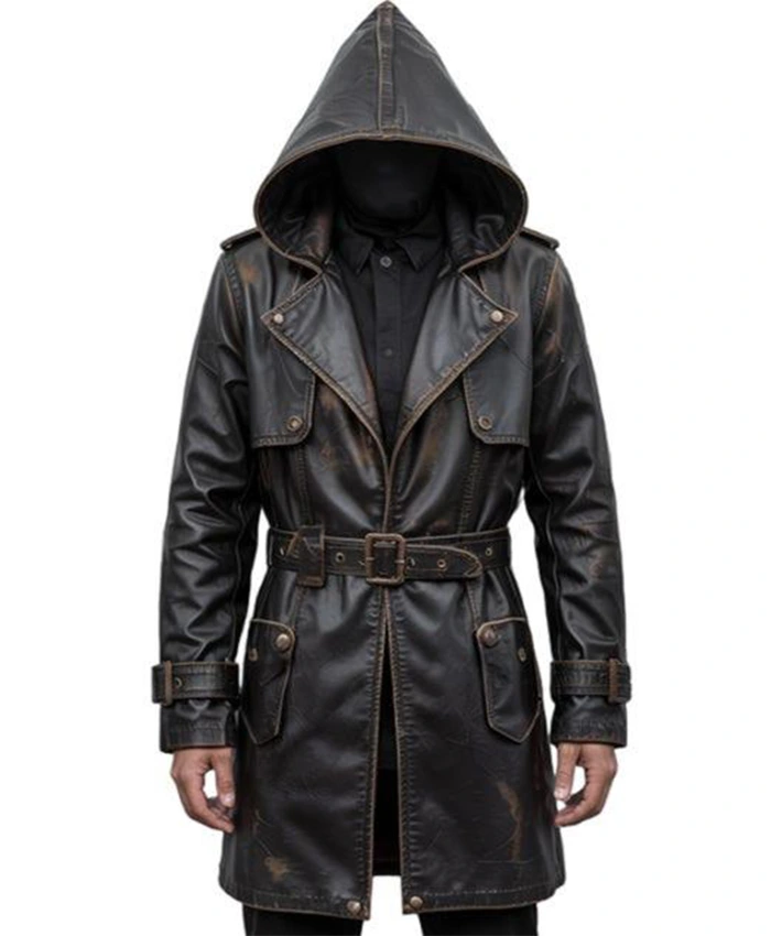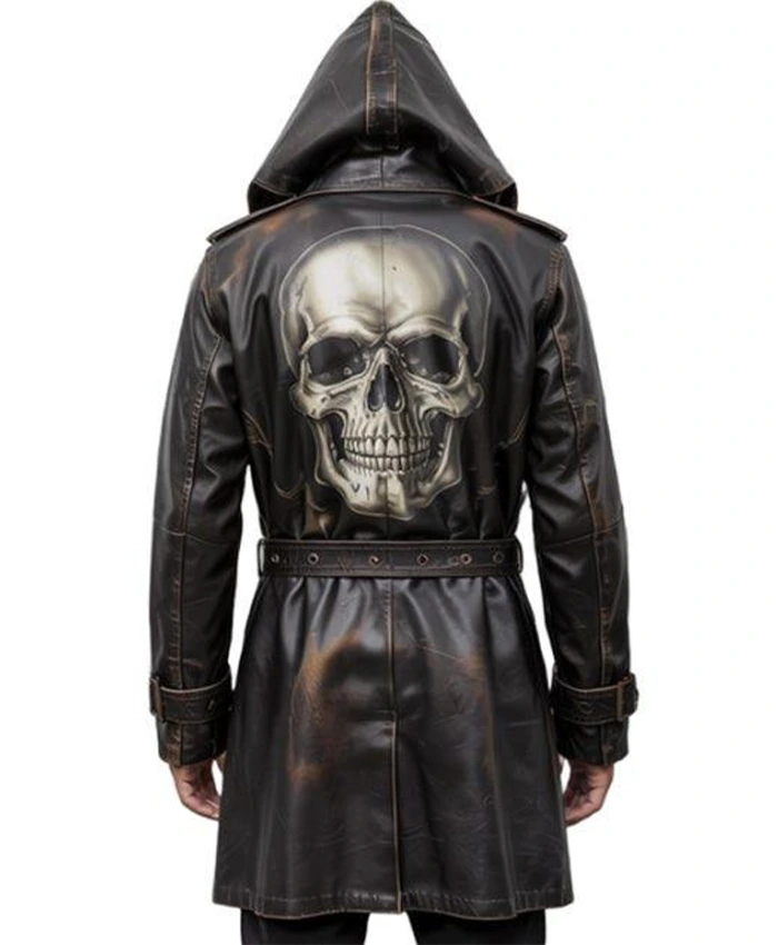 Halloween Skull Trench Coat – Gothic Hooded Leather Jacket