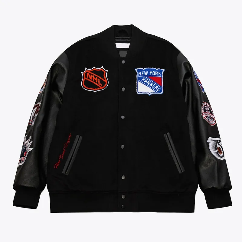 Stand out in modern fan fashion with the NY Rangers Black Out Team Logo Varsity Jacket, a 2025 edition crafted for those who want classic varsity style with a bold contemporary twist. Perfect for casual wear, game days, or making a statement in streetwear-inspired looks.