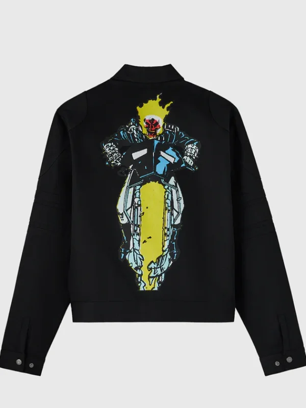 Unleash bold streetwear energy with the OVO Marvel Ghost Rider Denim Moto Jacket, a powerful fusion of high-fashion aesthetics and iconic Marvel attitude. Inspired by the legendary Ghost Rider, this jacket delivers an edgy moto silhouette combined with premium denim craftsmanship.