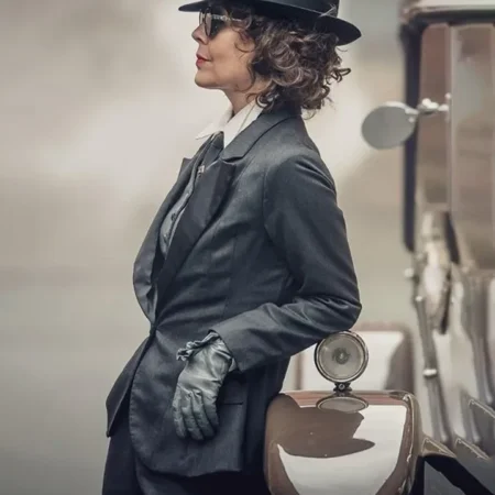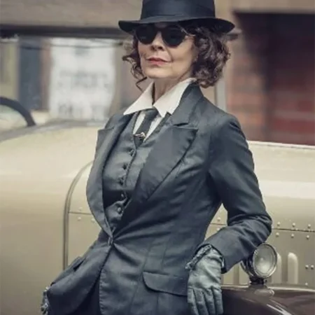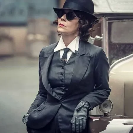 The Peaky Blinders Aunt Polly Season six Grey Suit had fancy-looking buttons on the front and full-length sleeves with buttoned cuffs. If we talk about the pockets in the suit, it has two outer and one inner pocket.