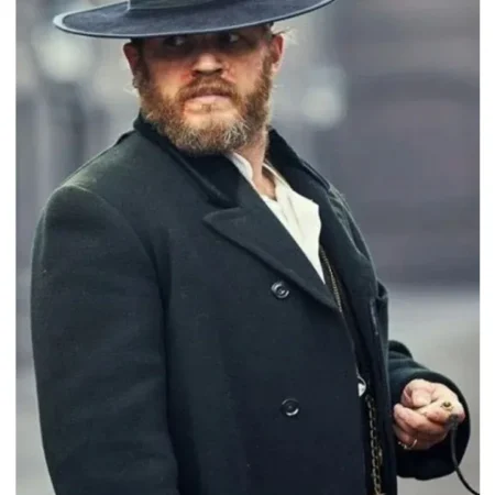 This Tom Hardy coat has long standard sleeves with open-hem style cuffs and a front with Buttoned closure,