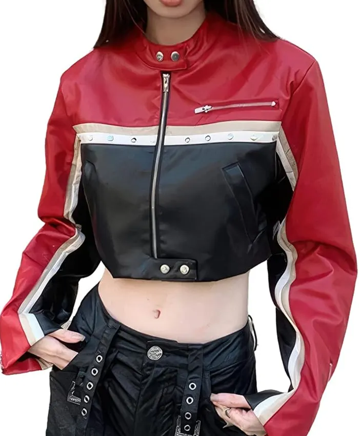 If you’re looking for cropped leather jackets? Choose this one which is ideal for you. The red and black cropped leather jacket combines bold style with a modern touch. because it is made from high-quality PU leather that provides a sleek appearance while remaining durable and lightweight. In the inside, this soft viscose lining ensures comfort, allowing you to wear it all day without compromising on looks or warmness.