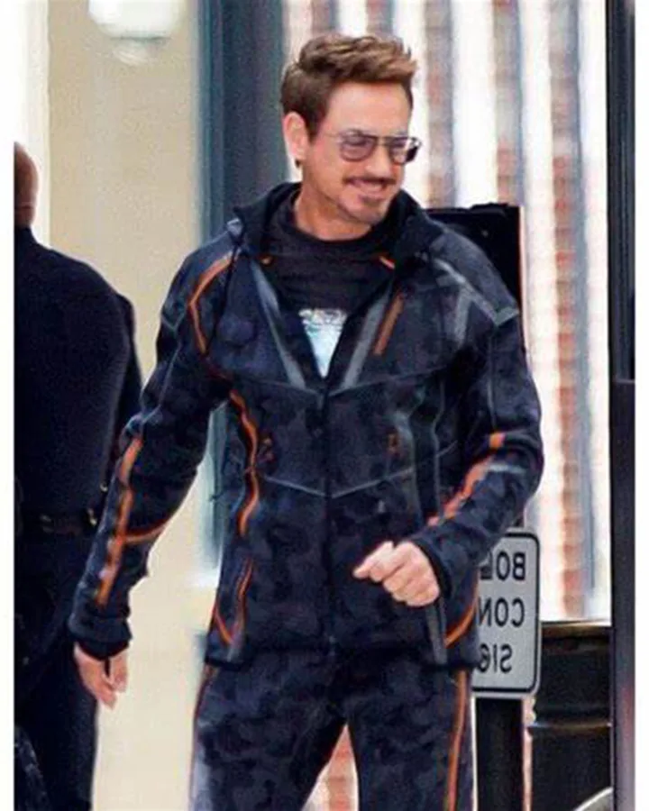 Robert Downey Jr. Infinity War Cotton Hoodie Jacket is one of the satisfying pieces that can be worn for an astounding look. The hoodie has comprised of camouflage textured cotton. and has an inside thick coating that will make you feel loose and calm when you will wear it. The Tony Stark hoodie is including YKK front zip conclusion and has full sleeves with orange strips that will give you an astounding appearance of a character. Look along with the edge pockets in which you can guard your profitable things.