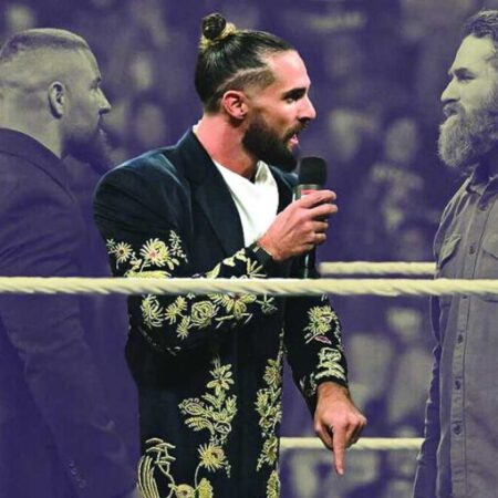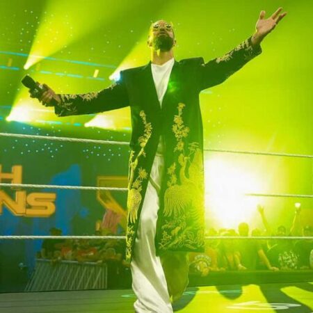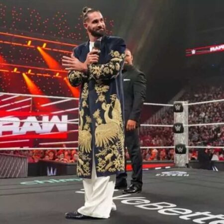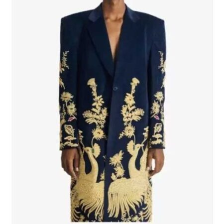 Make a royal entrance with the Seth Rollins Peacock Embroidered Sherwani Coat, inspired by his iconic appearance on WWE RAW. This stunning piece blends traditional South Asian design with Rollins’ bold fashion taste. The navy-blue long coat is adorned with intricate golden peacock embroidery, symbolizing elegance, pride, and power. Crafted in a flowing, sherwani-style silhouette, this coat makes a commanding statement — whether you’re stepping into the ring or attending a high-profile event.