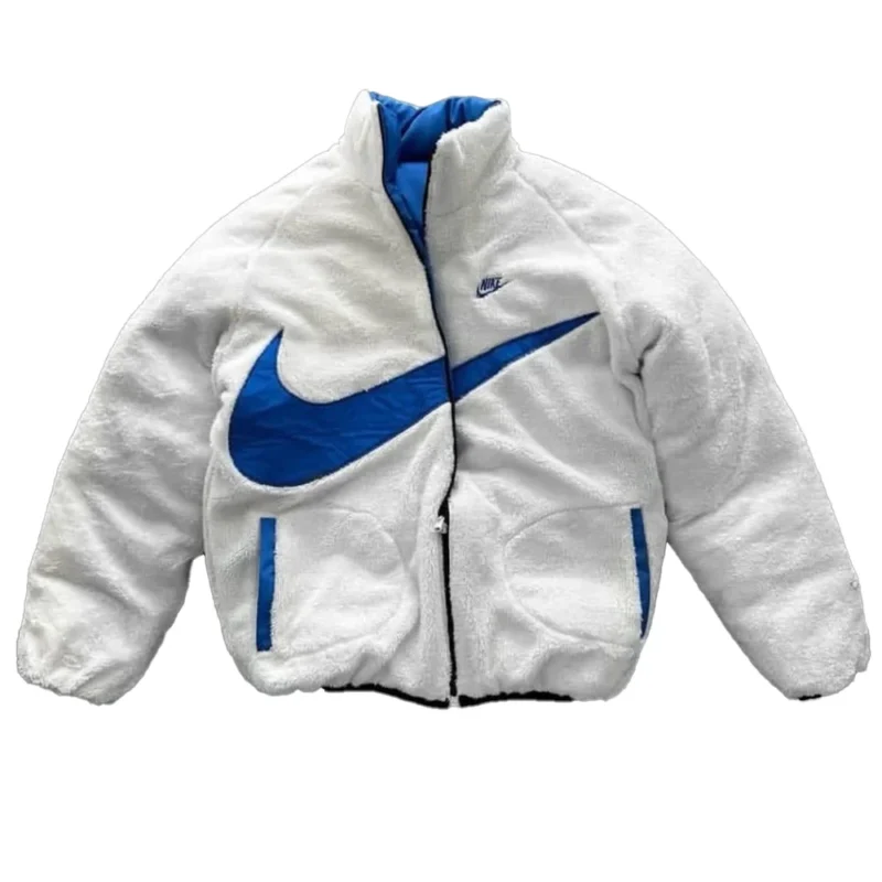 The jacket is designed with innovative thinking for versatility. The outer material is fleece fabric, and the inside is nylon fabric. Additionally, the stand-up collar has a clean, polished edge. Long sleeves with elastic cuffs keep you warm in colder months. The side of the jacket has two welt pockets, providing space and style. Moreover, the jacket includes a full zip-front to make it simple yet functional. The outside nylon jacket is sleek and appealing. Meanwhile, the inside fleece makes it soft and cozy. Furthermore, the swoosh on the outside provides a sporty look, while the inside black puffer jacket offers boldness. The comfort and modern style are evident in every stitch of this replica jacket.