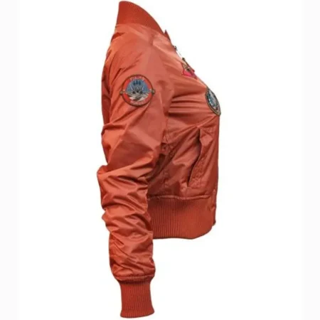 The slim-fitted bomber-style jacket has lined internally with a fine and smooth viscose. That increases the amount of comfort, warmth, and ease. Women?s Top Gun MA-1 Patches Rust Bomber Jacket has designed with satin fabric. Full-length sleeves with rib knitted cuffs, attractive rib knitted collars, and a rib knitted waistline characterize this rust-colored garment. The jacket features a quality zipped-up front closure, side waist safe and multiple front side pockets, and signature patches, badges, and logos neatly placed on the front.