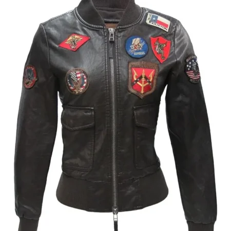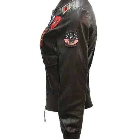 Women?s Top Gun Bomber Vegan Patches Black Leather Jacket