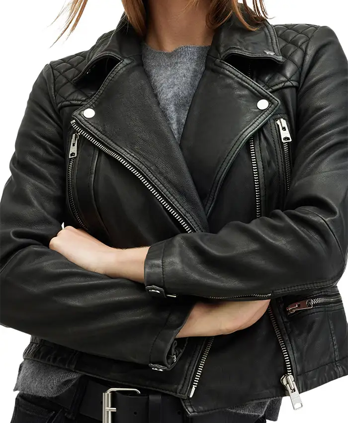 It is crafted with high-quality leather that is durable and famous for its luxurious appeal. Besides this, it has a soft and smooth viscose lining that is perfect for a breathable fit. With that, its stylish features include a front YKK zipper closure, quilted shoulders, biker collar, and zipper cuffs for both sturdy and stylish appeal. Also, it has full sleeves and multiple pockets to enhance its functionality. So, what are you waiting for? Shop it now from our Women Biker Leather Jacket collection!
